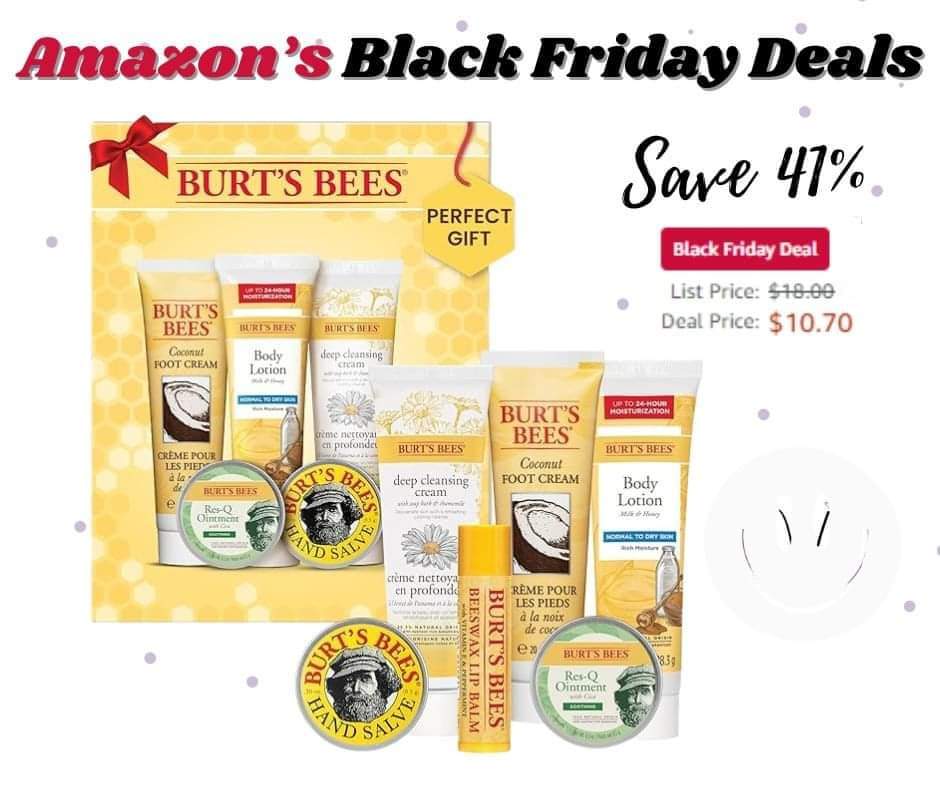 ππ π Gift Alert! 41% Savings on this Burt’s Bees Christmas Gift Set! Great Stocking Stuffer or gift for a neighbor, coworker or caretaker! This timeless minis kit has 6 great items – Original Beeswax Lip Balm, Coconut Foot Cream, Milk Honey Body Lotion, Deep Cleansing Cream, Res-Q Ointment & Hand Salve.