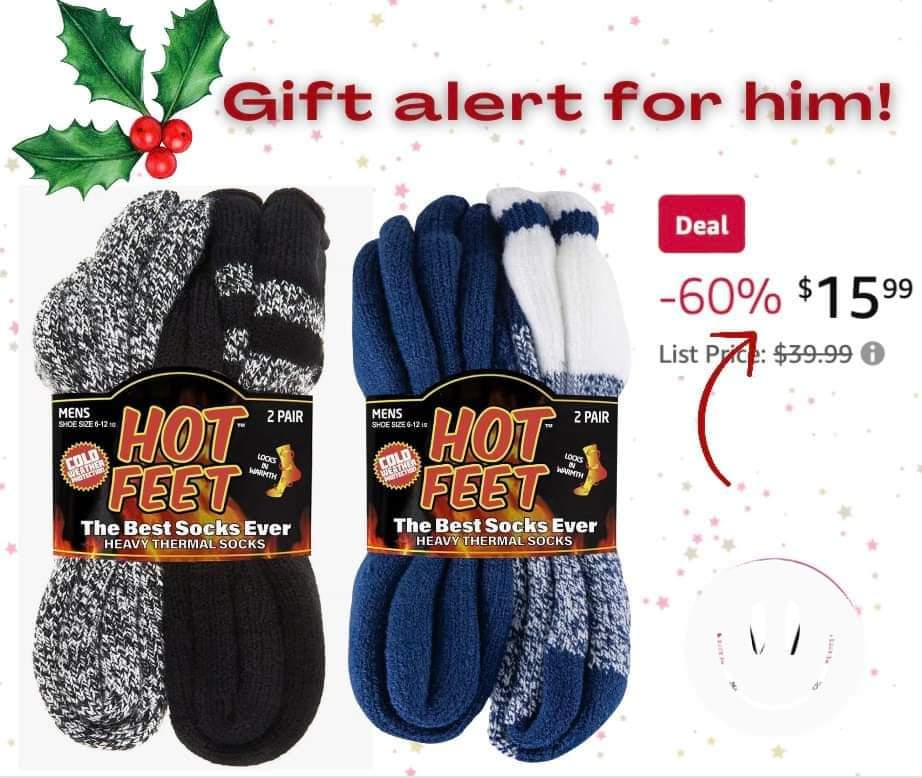 An awesome savings on the HOT FEET Thermal Socks for him! You get two pairs and they are perfect for keeping warm if your guy works outdoors, or enjoying time to ski and hunt.