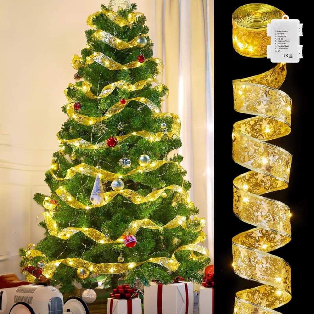 C0DE AUTO DEDUCTS AT CHECKOUT + CLIP COUPON Minetom Christmas Tree Ribbon String Lights – 33ft 100 LED Battery Powered Fairy Lights with Timer and 8 Lighting Modes,