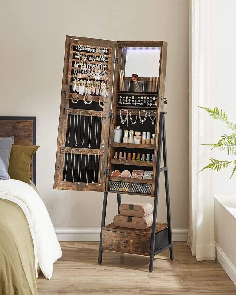 SONGMICS LED Cabinet Standing, Lockable Jewelry Armoire with Full-Length Mirror,