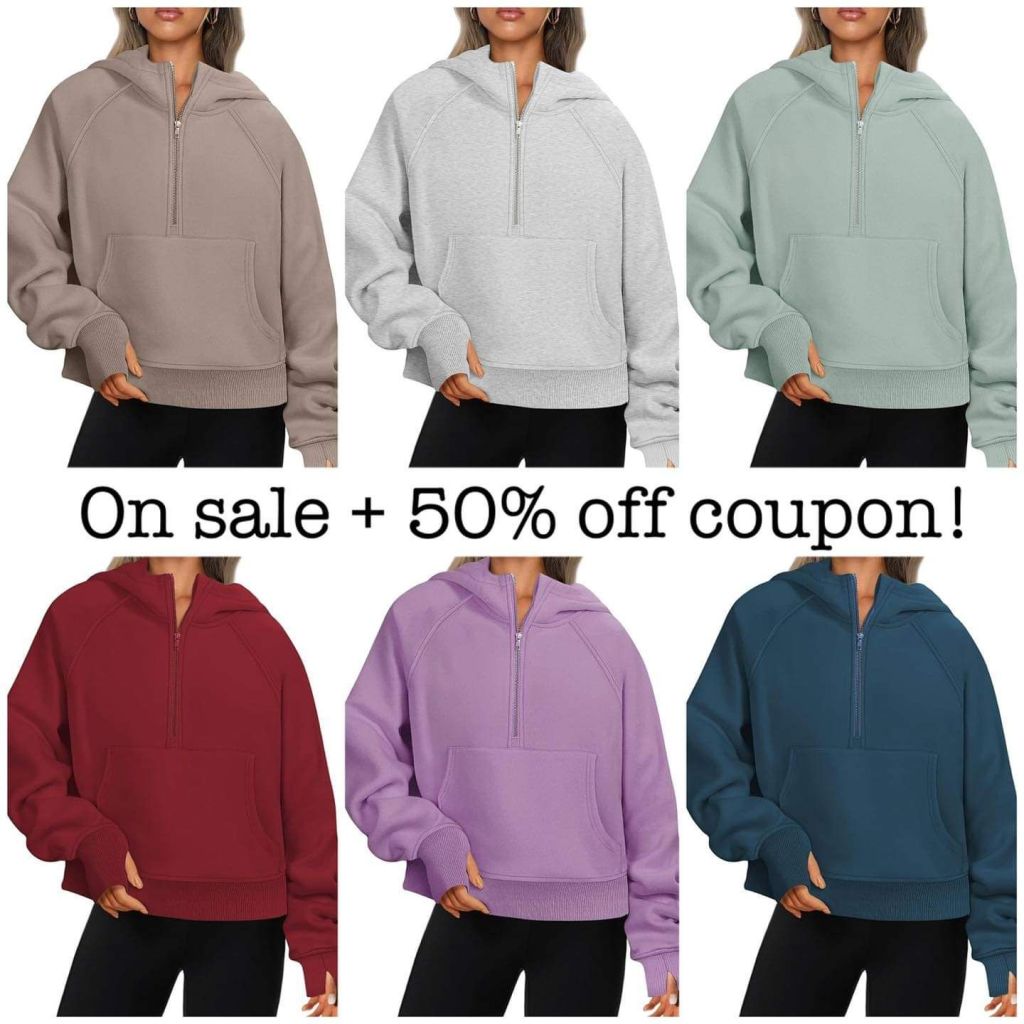 They’re back! ATHMILE cropped half zip hoodies with thumbholes are on sale + dropping 50% off on select colors when you click “redeem”. Hurry, sizes are going fast, smalls are already gone!