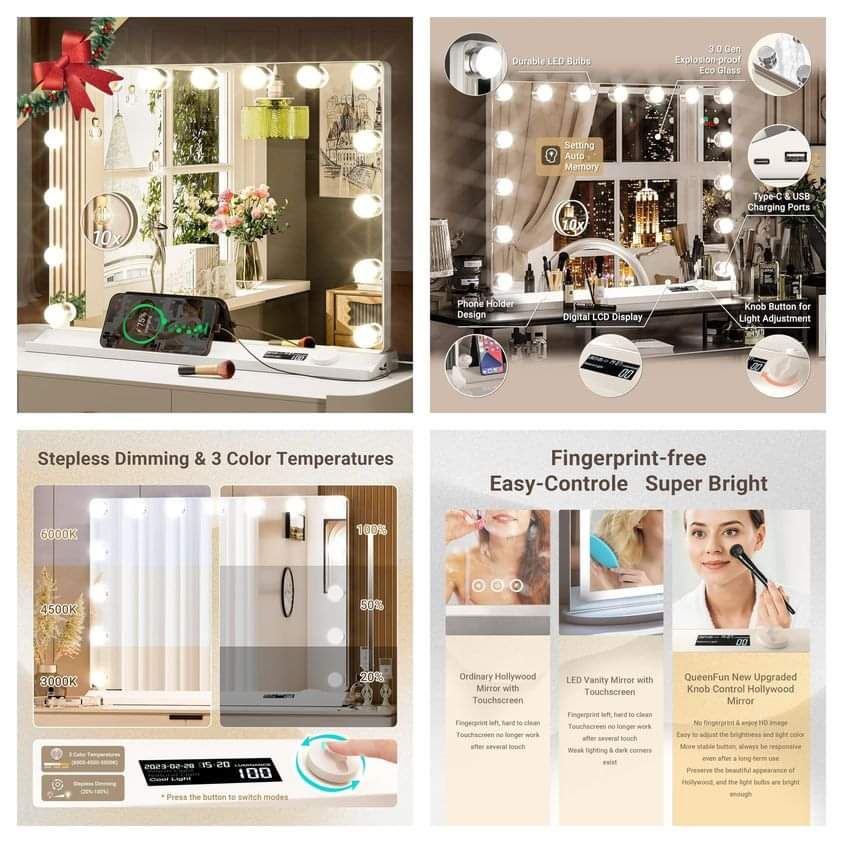 50% 0ff! Vanity Mirror with Lights, Stepless Dimmable 15-Bulb Hollywood Mirror with Charging Ports, clip qpon at checkout #ad
