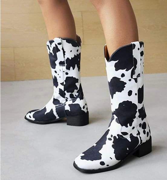 Cozivwaiy Women Cow Print Cowgirl Boots Chunky Heel Half Boots Pointed Toe Western Boots #ad