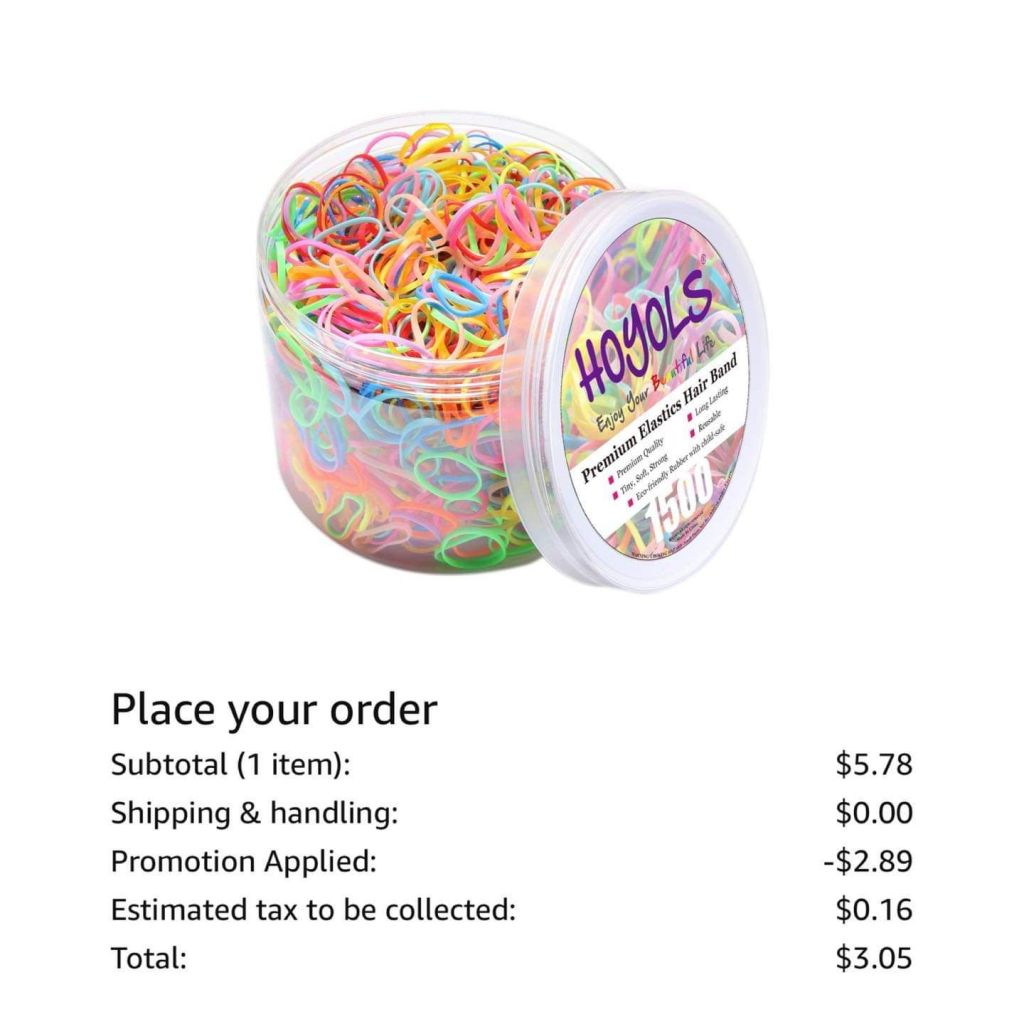 HURRY!! These hair ties rock and they are around $3 for 1500!! Enter PTVJDP9H at checkout and hit the arrow, not “continue”.