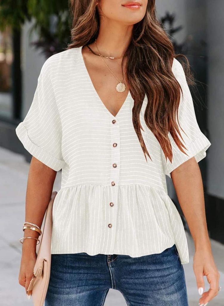 40% 0ff!! EVALESS Casual V Neck Peplum Tops for Women Short Sleeve Ruffle Hem Striped Shirts is on deàl at checkout #ad