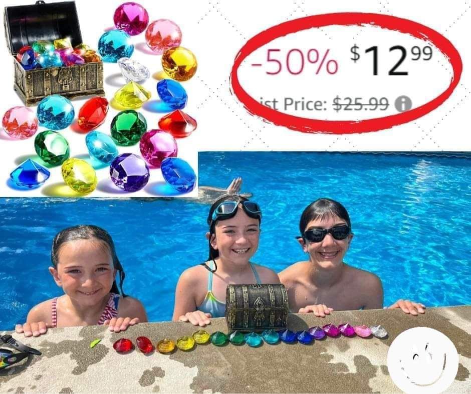 Group fashionistsa Erica Bergen Sprague says, “These diving gems and treasure chest have been a HUGE hit with my kiddos. Itβs kept them busy for hours in the pool. My daughters love organizing them by colors.”