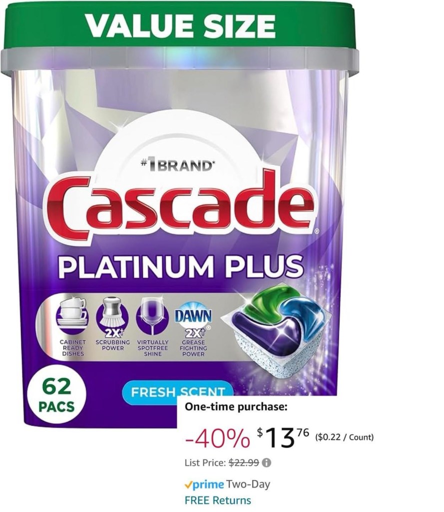 Holy smokes!! This Cascade Platinum Plus 62 count is down to $13.76, less with S&S, and sells at both Walmart and Target right now for $22.99!!! #ad
