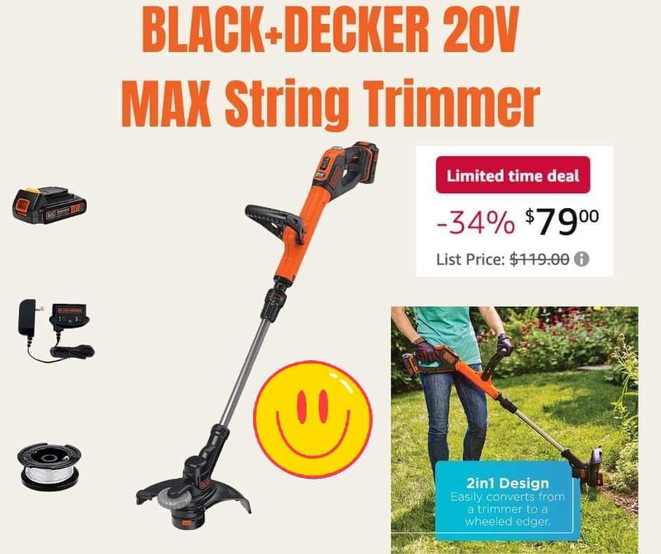 🔥 🔥 🔥 Limited Time Deal! BLACK+DECKER 20V MAX String Trimmer and Edger, Cordless, 12 Inch, 2-Speed Control, 2 Batteries, Charger, and Spool Included. The set includes 2 Lithium-Ion Batteries that are compatible with the Black and Decker 20V Max System. Get ready for that time of the year!