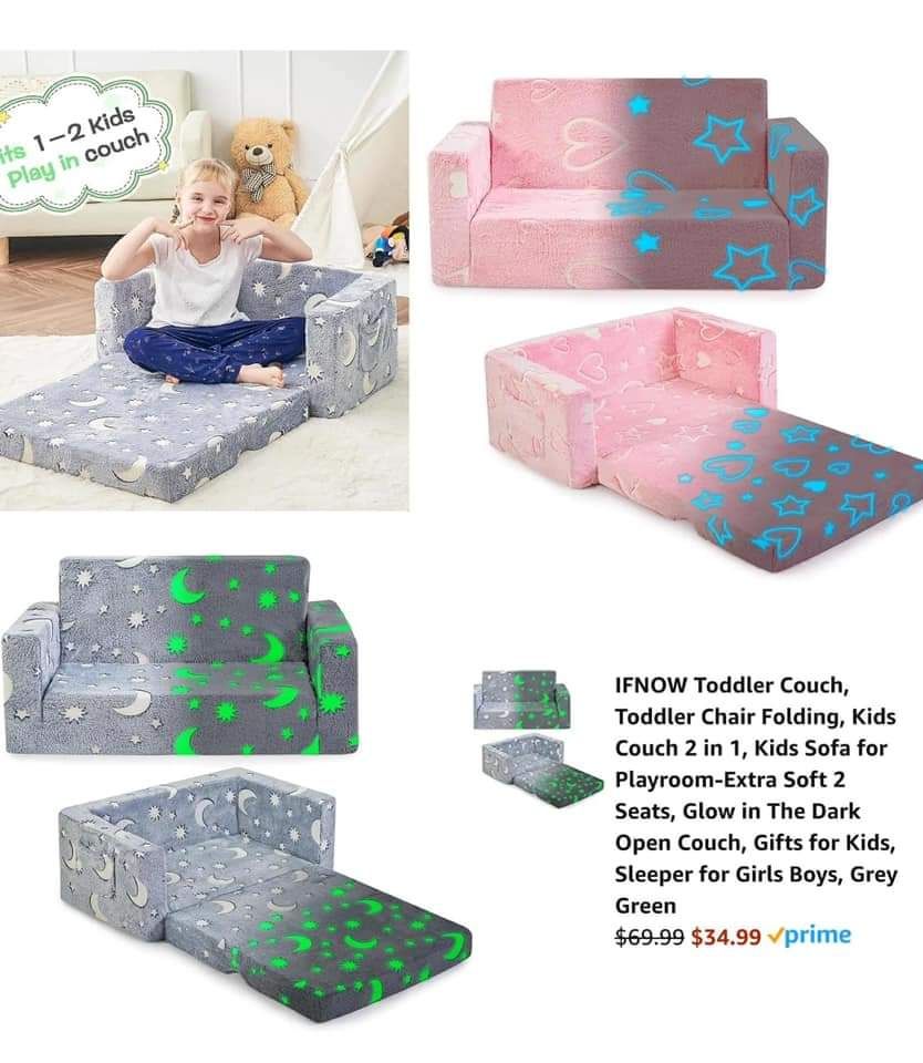 These glow in the dark toddler 2 in 1 chair/couches are 50% off with coupon and code J5GLLXH4 . Works on all except “blue glowing moon” option. Will end when so many sold.