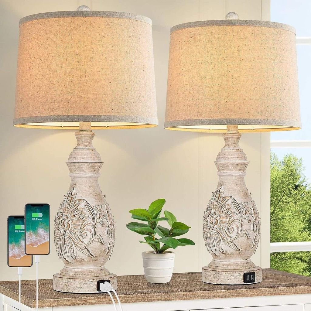 🏠🏠🏠 What a fantastic savings on these gorgeous floral-embossed lamps! You get the set of TWO with fabric shades for just $44! Standard rotary switch compatible with any E26 bulbs (Not Included) plus 2 USB charging ports in each base!