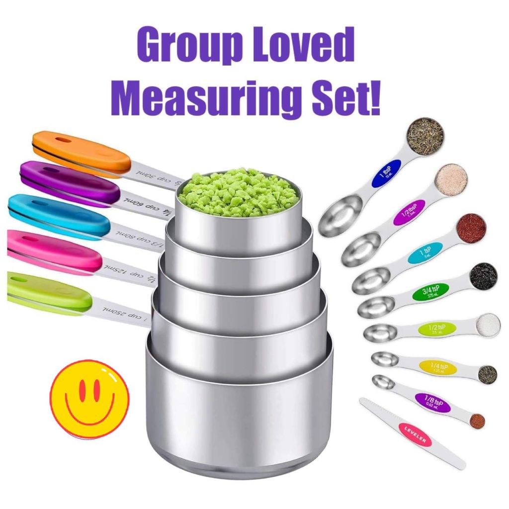 πππ A fantastic kitchen helper for the cook! This 13-piece stainless steel set includes 5 measuring cups, 7 magnetic measuring spoons, and a handy leveler. All with colorful handles.