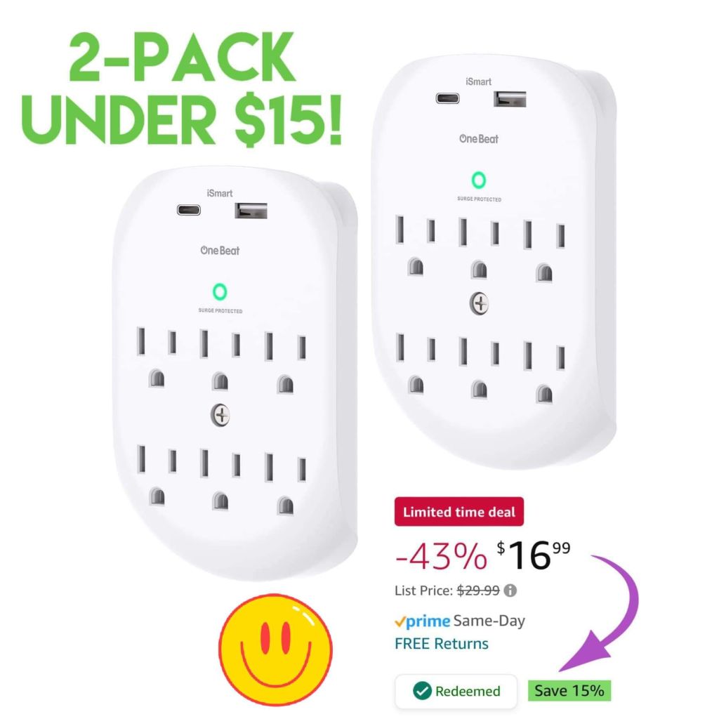 π₯π₯π₯ This is a fantastic savings from ONE BEAT! Grab the pack of TWO plug-in outlet extenders for under $15! Each one gives you 6 A/C outlets plus 2 USB ports. Perfect for the dorm room, kitchen counter, or work space!