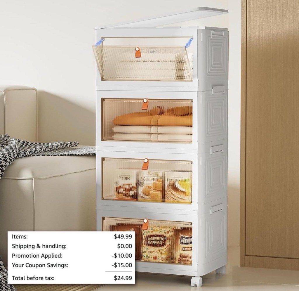 This 4-tier stackable storage set drops to just $24.99 shipped when you clip the coupon AND use the code 4ZHLT6PI at checkout! 50% off! #ad