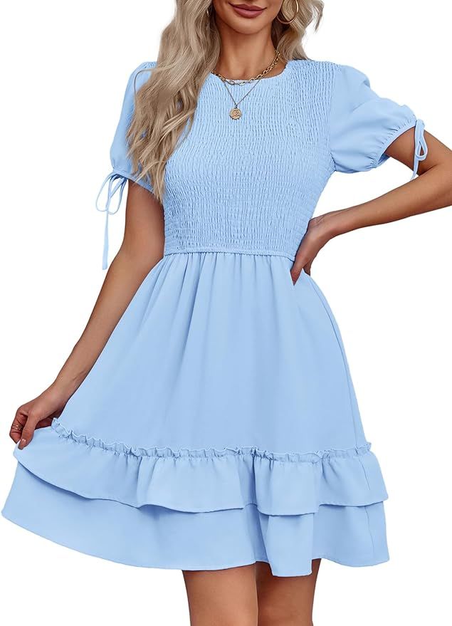 50% 0ff!! Fisoew Womens Summer Casual Ruffle Mini Dress Short Sleeve Cute Babydoll Smocked Short Dresses is on deàl at checkout #ad