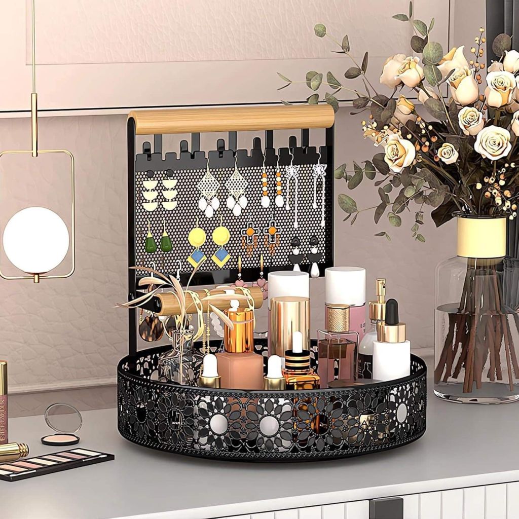 πππ What a fantastic way to organize your dresser or vanity! This brand new rotating caddy is super versatile! Store and display your favorite skincare, cosmetics, nail polish and toiletries in the tray, plus keep your jewelry pieces right in view. The handy mesh screen and hooks hold your earrings, necklaces and bracelets. I love this for a dorm room!