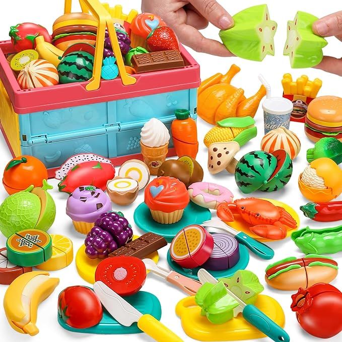 40% 0ff!! 100 PCS Cutting Play Food Set for Kid Kitchen, Storage Basket with Vegetable & Fruit Toy for Toddler Boy Girl, is on deàl use qode DUUZJAYM at checkout #ad