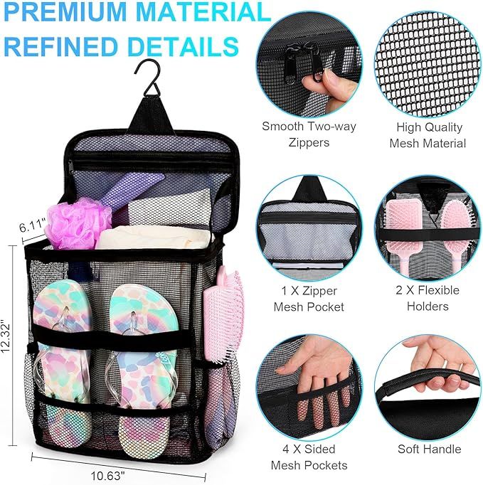 πΏπΏπΏ A fantastic addition to the college dorm box! This mesh hanging shower caddy is super versatile and roomy! Tons of pockets and space for all the hair and skincare products plus shower shoes, pouf, and more!