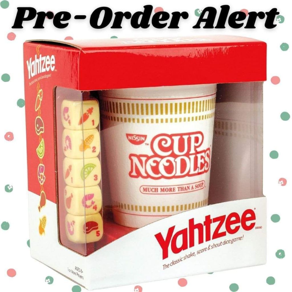 Includes custom Cup Noodles dice cup, custom scorepads and custom Yahtzee dice featuring unique icons familiar to Cup Noodles fans – chicken, beef, shrimp, lime, corn, and carrots! I must have it!!