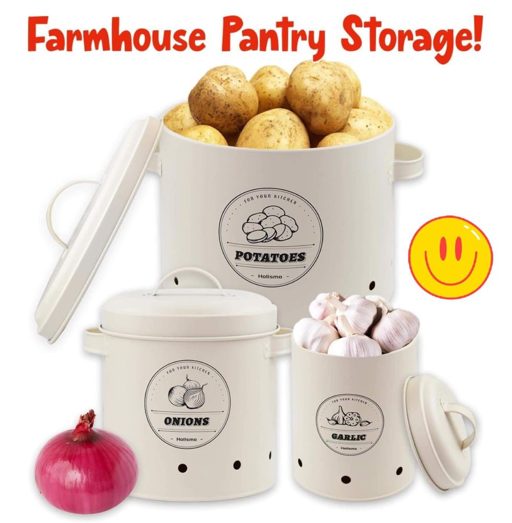 🏠🏠🏠 Oh I love this! An adorable set of THREE metal canisters, perfect for keeping your root veggies fresh and close at hand! You get a potato, onion, and garlic can, perforated for air flow with handled lids. Such an attractive and functional kitchen accent! The whole set drops to just $20!