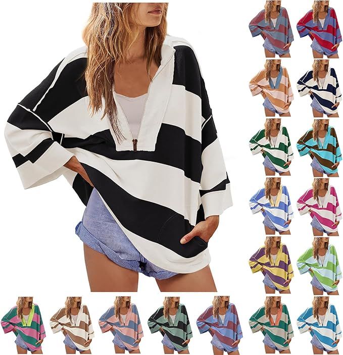 40% 0ff!! Womens Oversized Striped Shirt Half Zip Sweatshirt Color Block V Neck Top are on deàl + use qode LBDYH8ID at checkout #ad