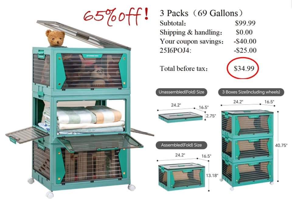 65% off suppimiraOctober 11, 2024Deals Post navigation PreviousNext 65%off 3 Pack Collapsible Storage Bins with Lids and Wheels(69 Gallons)Add to cart AND clip coupon on the product page, then go the whole way to checkout Ad SHOP DEALS Share this: Share on X (Opens in new window) X Share on Facebook (Opens in new window) Facebook Like Loading...