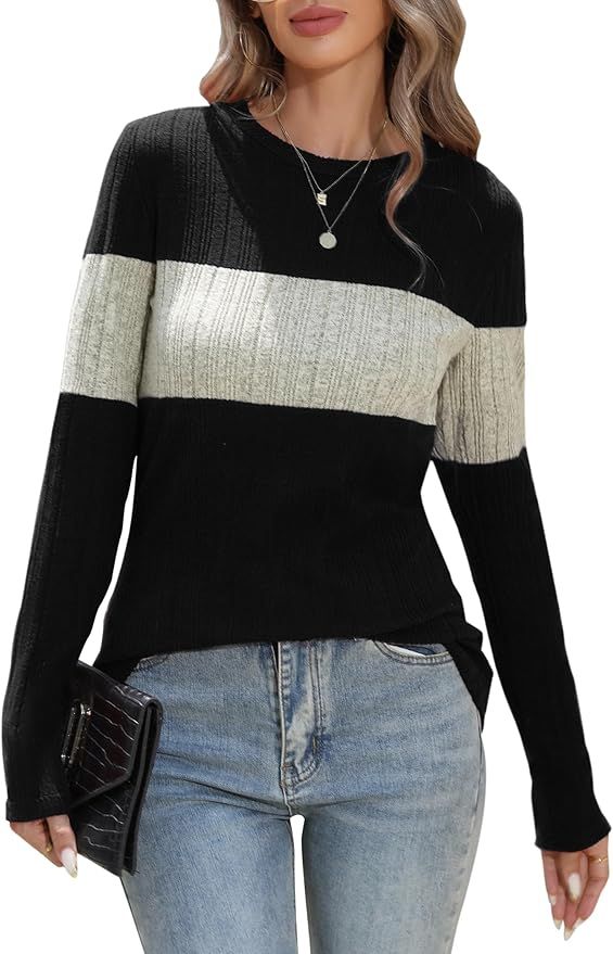 35% 0ff!! Women Long Sleeve Blouses Colorblock Pullover Sweaters Round Neck Striped Slim Fit Tops is on deàl at checkout #ad