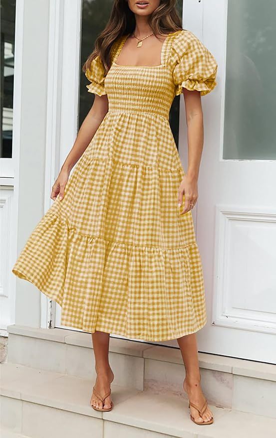 47% 0ff!! ZESICA Women’s Bohemian Summer Plaid Square Neck Puff Sleeve Ruffle Flowy Beach Midi is on deàl clip qpon at checkout #ad