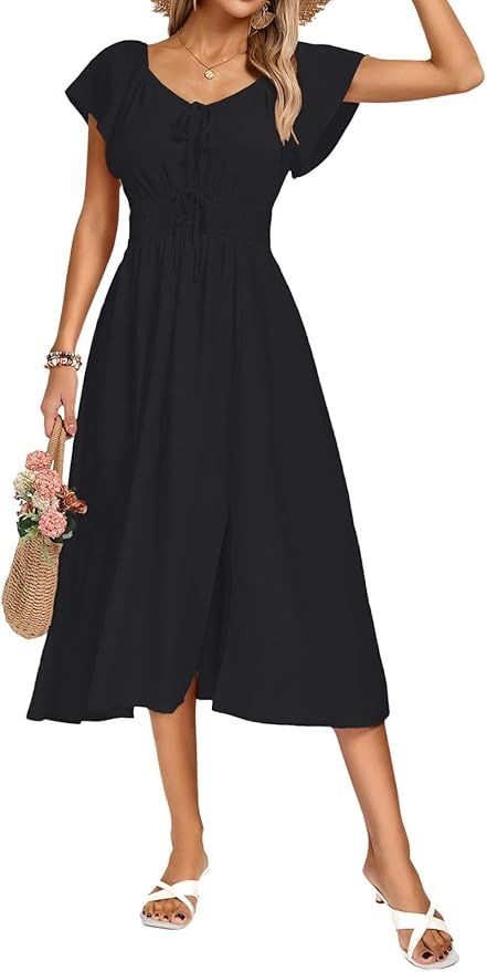 50% 0ff!! Kate Kasin Women’s Summer Casual Short Sleeve V Neck Smocked Waist Split A Line Casual Vacation Boho Flowy Midi Dress is on deàl clip qpon at checkout #ad