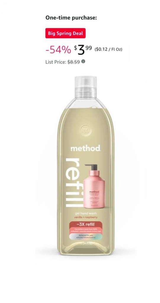 Ooh, grab this Method gel hand soap refill in Vanilla + Raspberry while there’s a pr!ce dr0p. This smells so good. It’s 54% 0ff, making it 3.99 for this bottle. #ad