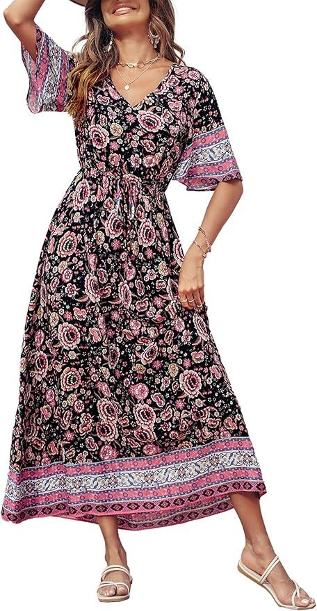 50% 0ff!! Women’s Casual Summer Boho Floral Print Dress V Neck Short Sleeve High Waist Long Maxi Beach Dresses is on deàl clip qpon at checkout #ad