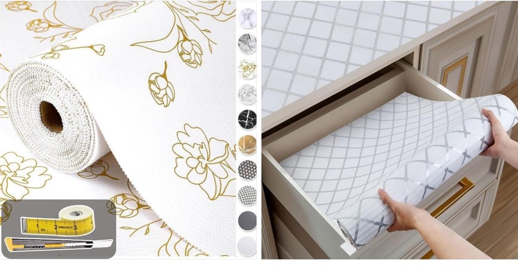 Shelf liner sale alert! The left one is a coupon lover’s dream with 40% off, and the right one is a bargain hunter’s delight at under $5! Both have a plethora of color and design options, woohoo! #ad