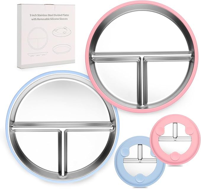 40% 0ff!! Stainless Steel Kids Plates, 2 Pcs Baby Silicone Suction Plate, 9″ Divided Toddler Stainless Steel Plates is on deàl clip qpon at checkout #ad