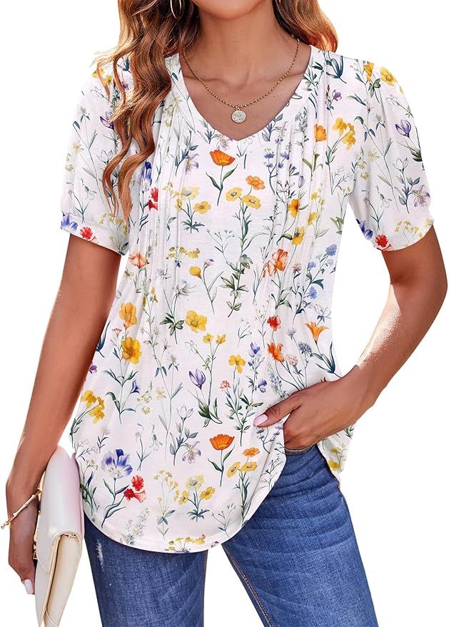 34% 0ff!! Zeagoo Women’s Puff Short Sleeve Boho Shirts Casual V Neck Floral Solid Summer Blouse is on deàl clip qpon at checkout #ad