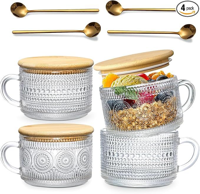 40% 0ff!! 4pcs Vintage Glass Coffee Mugs Cups, Overnight Oats Containers Glass Cups Mugs with Bamboo Lids and Spoons AD
