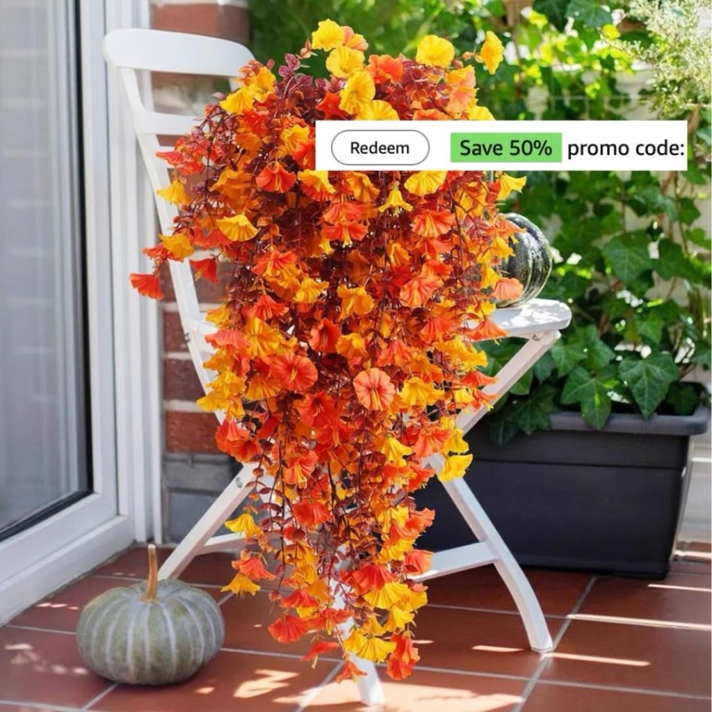 🍂 5️⃣0️⃣ % 0FF the gorgeous CASCADING fall flowers you can put in your pots or swap out your HANGING baskets!! 🎃 Perfectly primed for PUMPKINS and you don’t have to stress or fuss over them!! Ad
