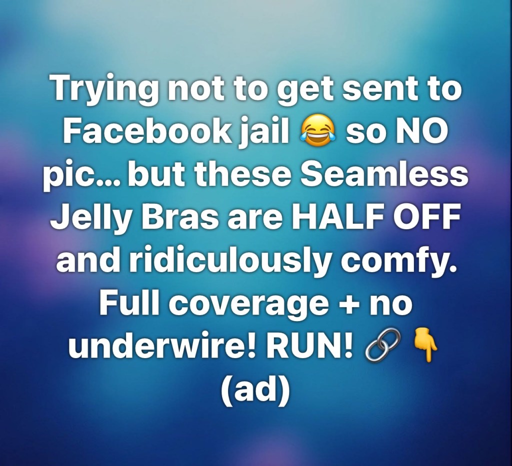Trying not to get sent to Facebook jail π so NO picβ¦ but these Seamless Jelly Bras are HALF OFF and ridiculously comfy. Full coverage + no underwire! RUN! ππ (ad)