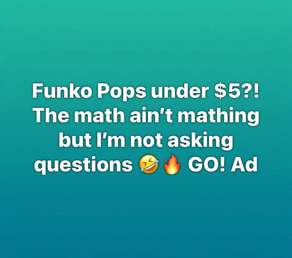 Funko Pops stutidavewpNovember 26, 2025Amazon, Deals Post navigation PreviousNext Funko Pops under $5?! The math ain’t mathing but I’m not asking questions 🤣🔥 GO! Ad DEAL Share this: Share on X (Opens in new window) X Share on Facebook (Opens in new window) Facebook Like Loading...