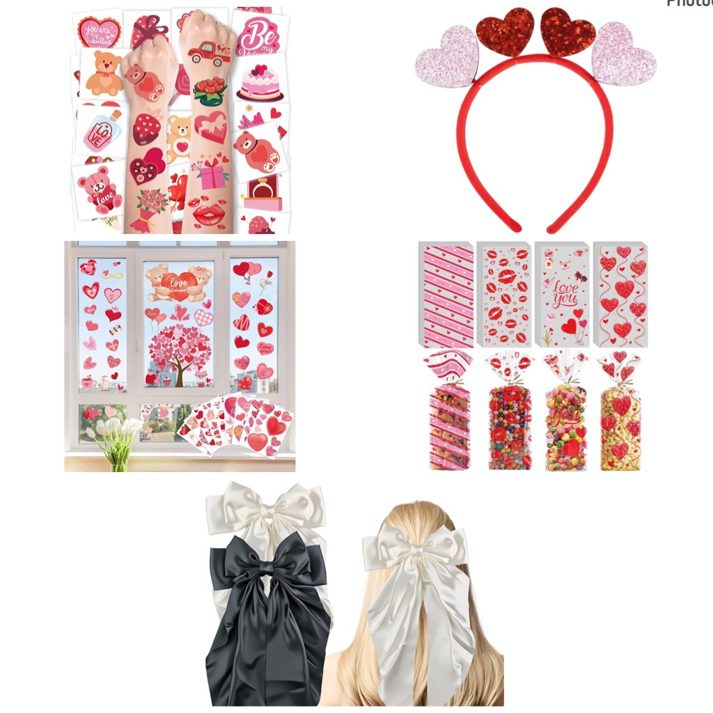 A whole bag of VALENTINE FUN!!! π Tattoos for the kids π Treat bags for class parties π Window decals to decorate πͺπ PLUS the CUTEST hair bows + heart headband ππ Snag it for half off!! ππππ AD