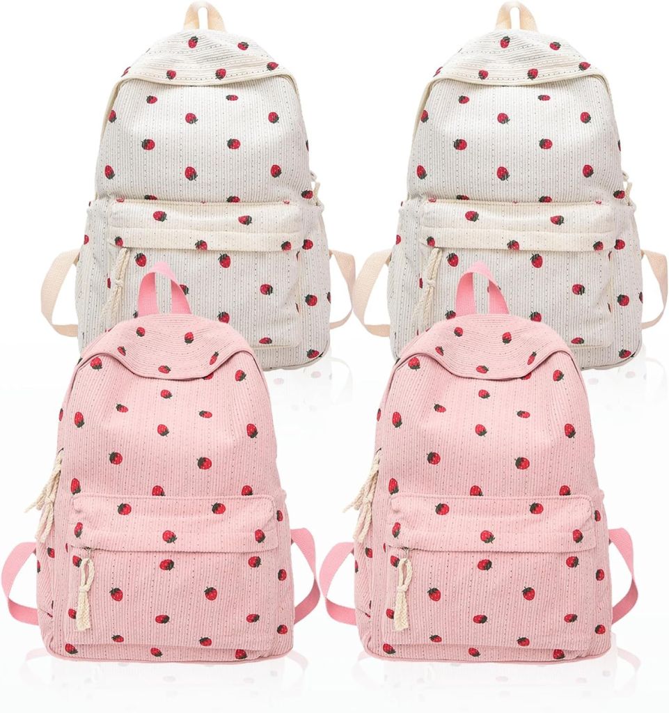 50% 0ff!! Strawberry Corduroy School Bookbag & Travel Daypack, Lightweight Large Capacity Backpack for Daily Use (2 White & 2 Pink) AD
