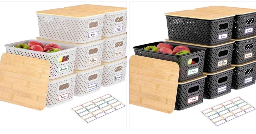 These stackable storage baskets with wood lids are such a good find. Perfect for pantries, bathrooms, laundry rooms, craft supplies, or office clutter. Love that they come with labels too! Half off with our🔗⬇️ (ad)