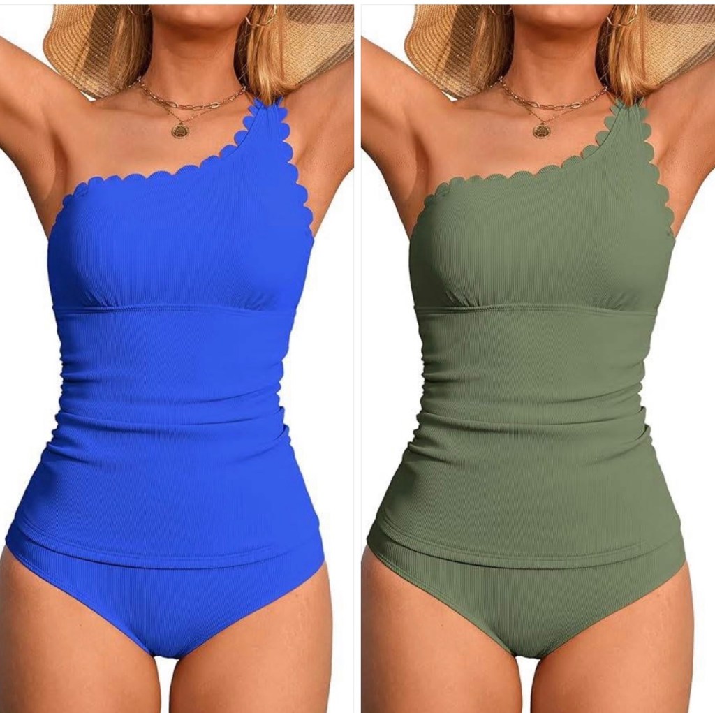 Obsessed with the scalloped detail on these!! 💙💚 These one-shoulder swimsuits are 30% OFF right now and look so flattering! (Ad)